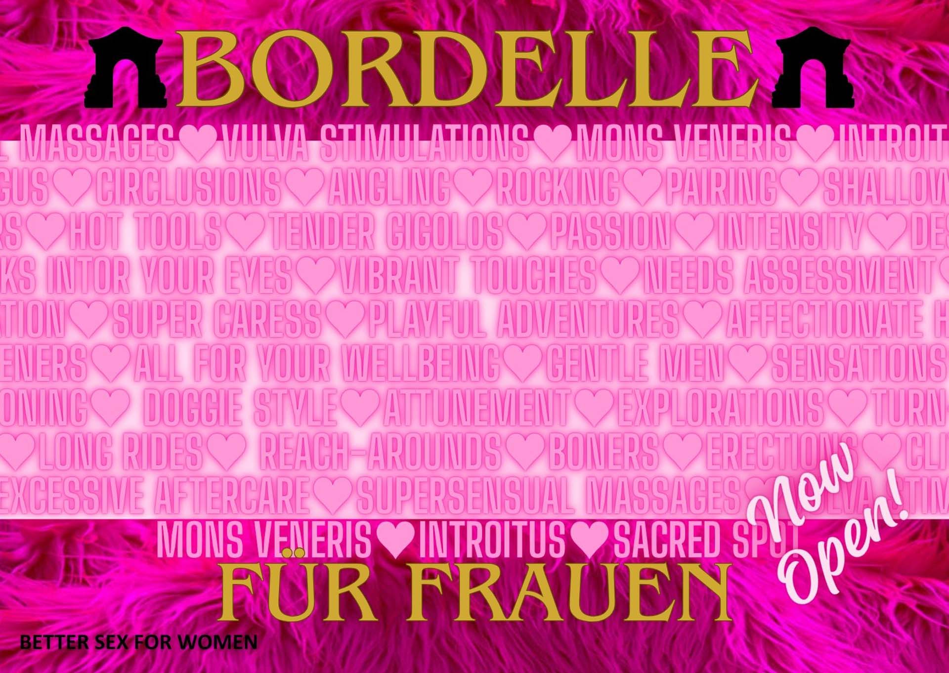 Tatsächlich existiert die Frau als Begehrende in unserer Gesellschaft nicht. Während der Mann jederzeit und überall seine Lust realisieren kann, gibt es für Frauen weder Stimuluslieferanten wie Pin-ups, Callboys oder andere Lustbringer in der sichtbaren Öffentlichkeit. Auch existieren keine Sexkaufmöglichkeiten, die über die merkwürdig entsexualisierten Angebote in einem therapeutischen Rahmen oder zur pornographischen Weiterbildung der Frau hinausgehen. Statt sexueller Befreiung wird auf diese Weise die sexuelle Verfügbarkeit von Frauen fortgeschrieben. Ihnen bleibt nur noch, ihren Sexualtrieb wegzukonditionieren, möchten sie der männlichen Dominanz entgegenwirken. Mit dieser defensiven Sexualität kann die Frau nur die käufliche Position einnehmen. Männlichen Prostituierten in einem Bordell käme die Funktion zu, das sinnliche Begehren aus den Zwängen ungleicher Machtverhältnisse zu lösen und Frauen durch Entpassivierung aus der emotionalen Abhängigkeit von Männern zu befreien. Stattdessen bieten Männer wie auch Transfrauen prostitutive Dienste nur für andere Männer an. Männliche Reize werden lediglich in einem homoerotischen Kontext gesetzt oder egotauglichen Männerfantasien untergeordnet.